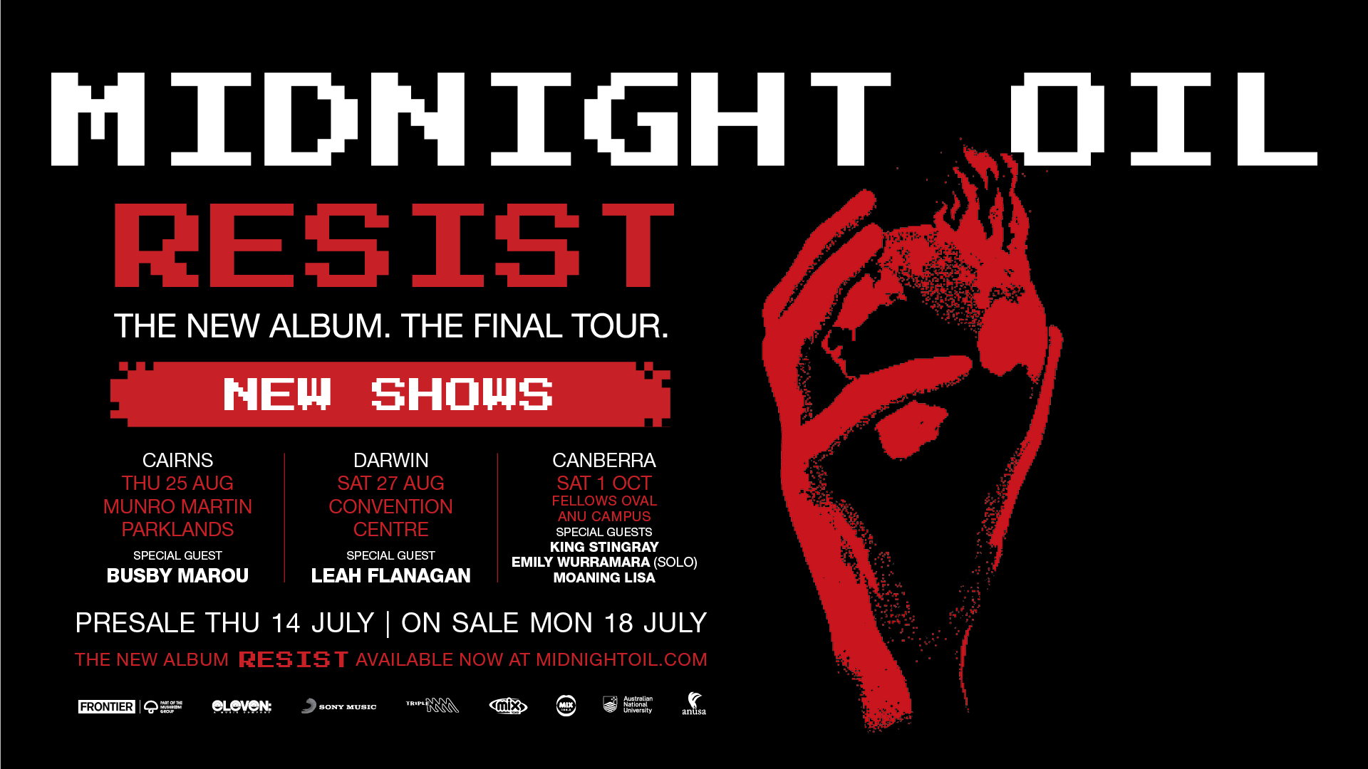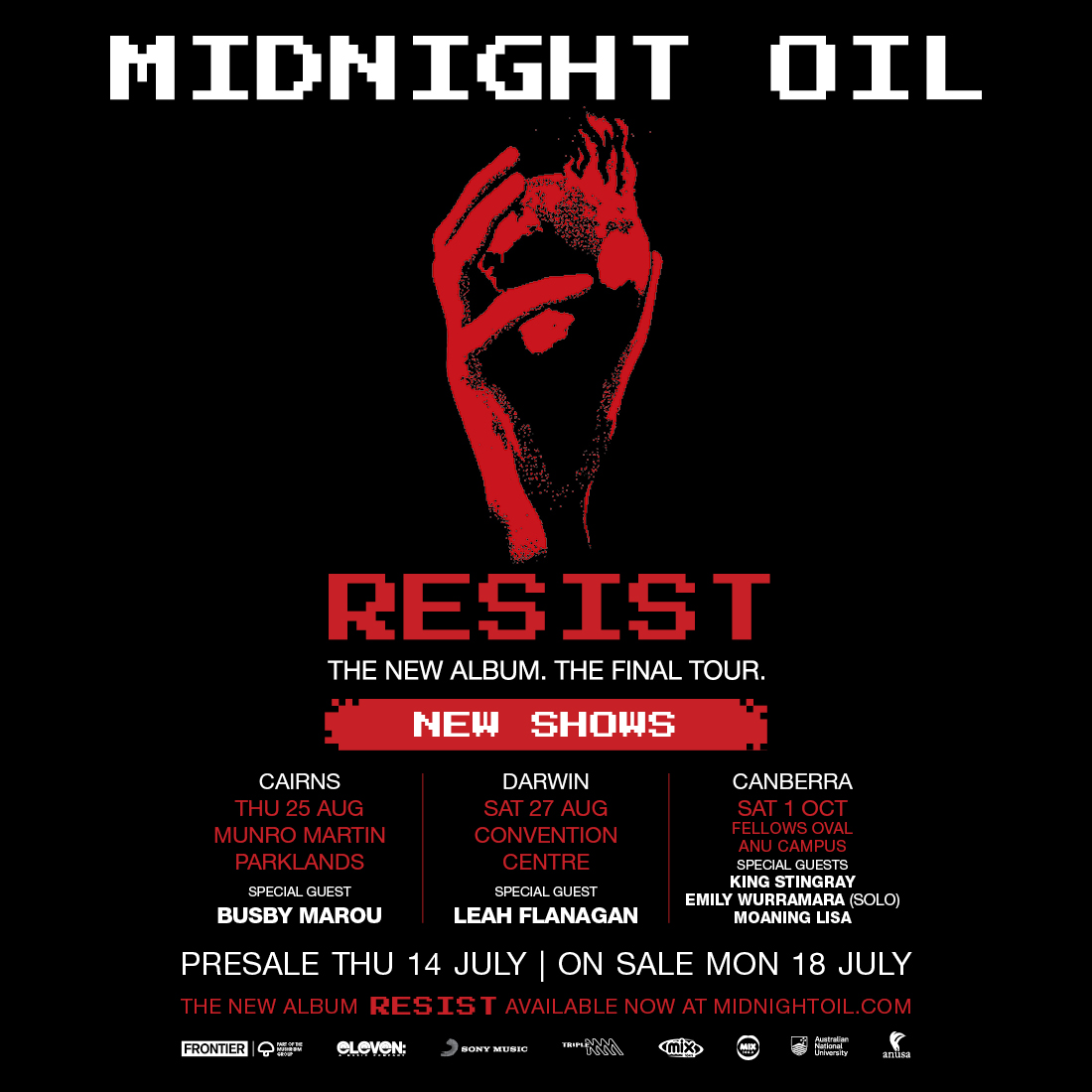 Don’t miss Midnight Oil “Resist: The Final Tour”, final shows. Tickets from frontiertouring.com/midnightoil.