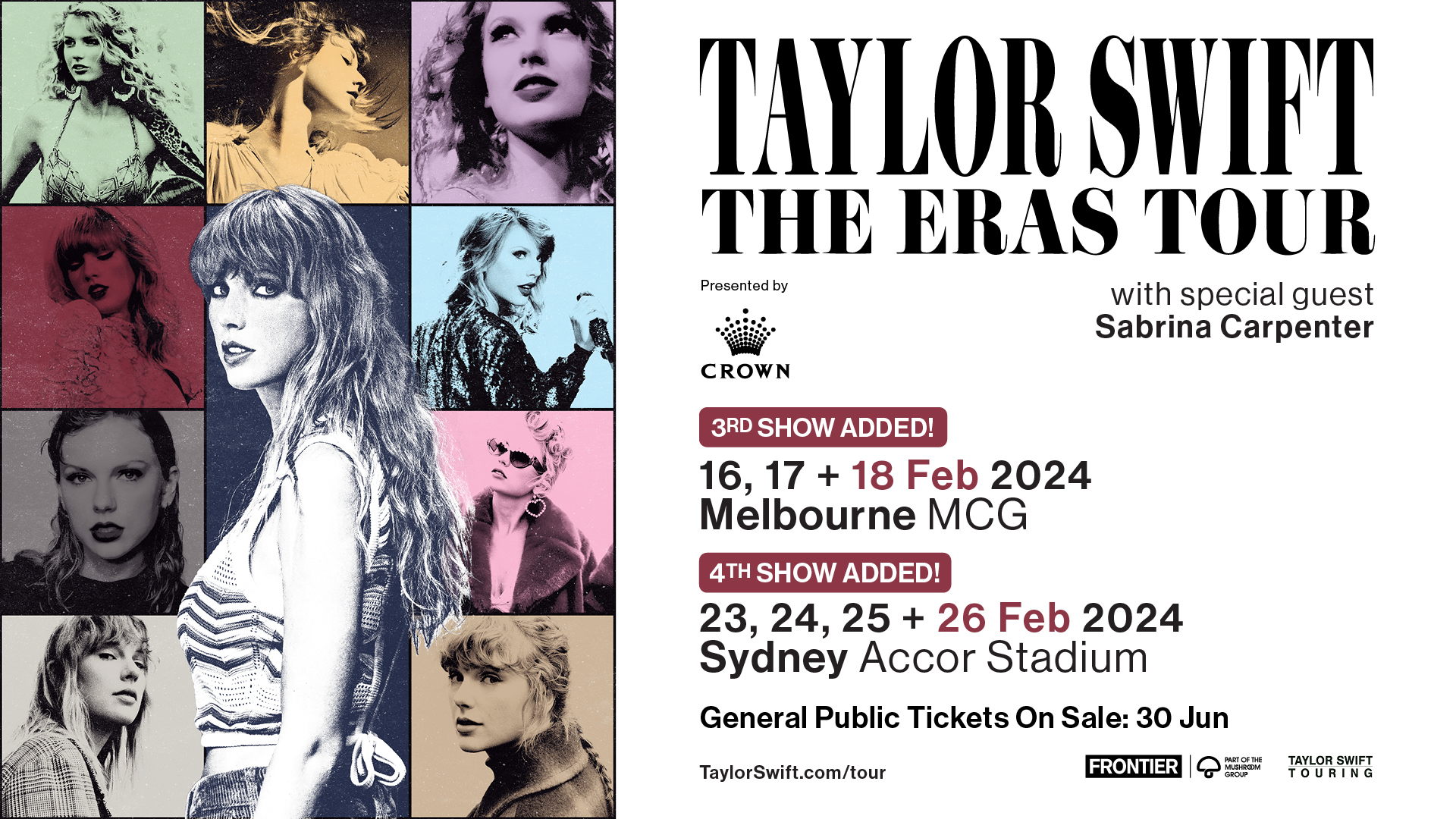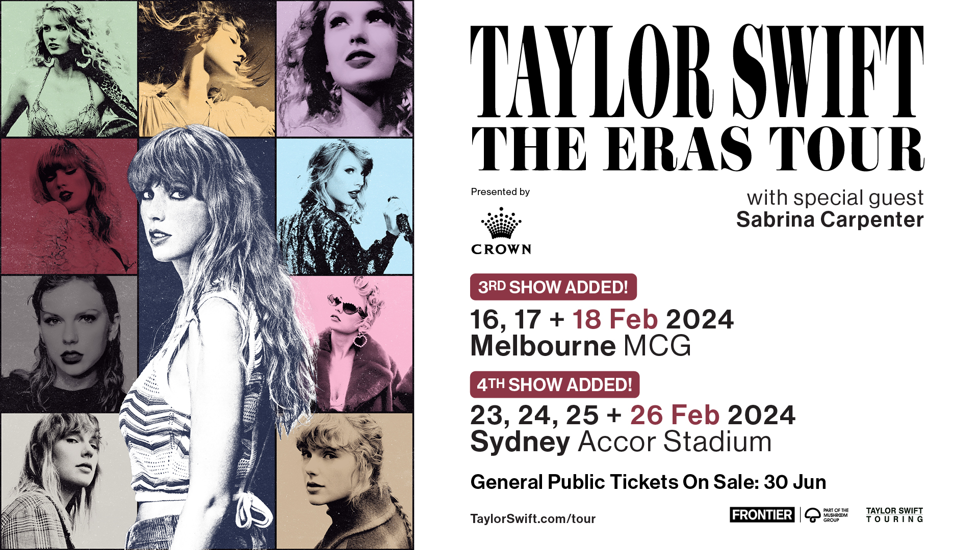 The Australian dates of Taylor Swift | The Eras Tour, presented by Crown and Frontier Touring, will kick off on 16 February 2024 in Melbourne and 23 February 2024 in Sydney with special guest artist, Sabrina Carpenter.